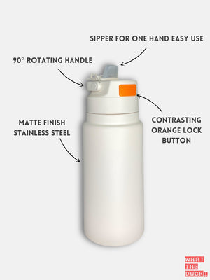 **Materials:** Matte stainless steel flask with plastic lid, rotatable handle, BPA-free silicone straw, double-walled insulation, BPA-free, phthalate-free, and PVC-free.